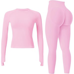 Top: Features a long-sleeve, close-fitting, cropped silhouette, ideal for layering or solo wear during workouts. The pink top has a mock neckline and raglan sleeves, while the black top has a classic crew neck. Both include thumb-hole cuffs for a secure fit and extra warmth.