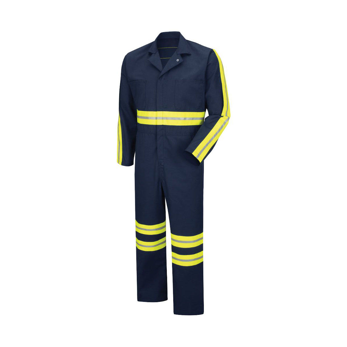 Description: This heavy duty coverall is sized to be worn over your clothes. It comes with two way brass zipper with gripper at top and lapel, two set-in front, two chest and two patch hip pockets. This garment is enhanced with 2.5 reflective striping in several different key sections for maximum visibility. With its heavy duty construction and relaxed fit, it will keep you comfortable the whole daySizes: S,M,L,XL,XXL,XXXL